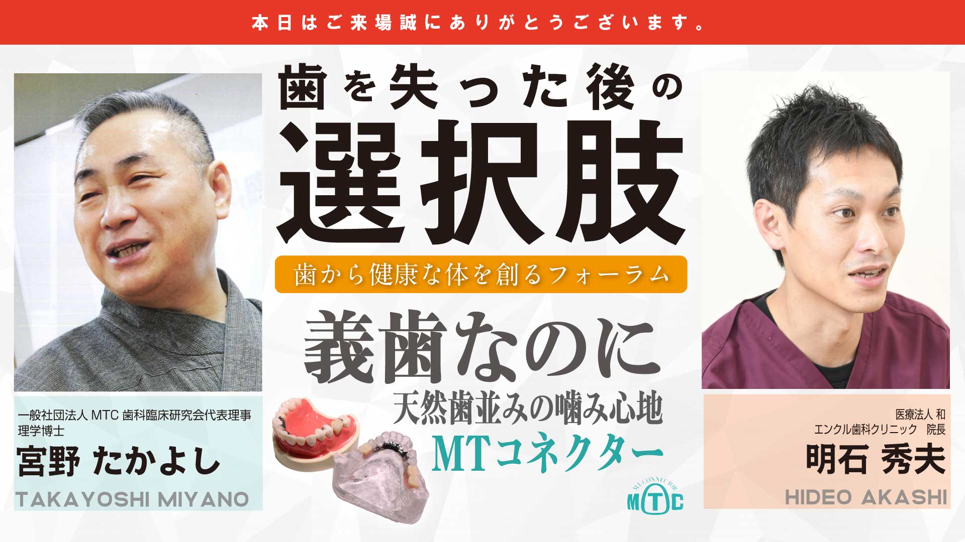 その後、宮野たかよし氏が開発をした当院でも導入させていただいてる【MTコネクター】のお話を頂きました。歯を失い、ブリッジや入れ歯、インプラントをご検討されている方には、第4の選択肢【MTコネクター】も一度ご検討いただけますと幸いです。ご相談自由となっておりますので、気になる方はお気軽にお問合せください。